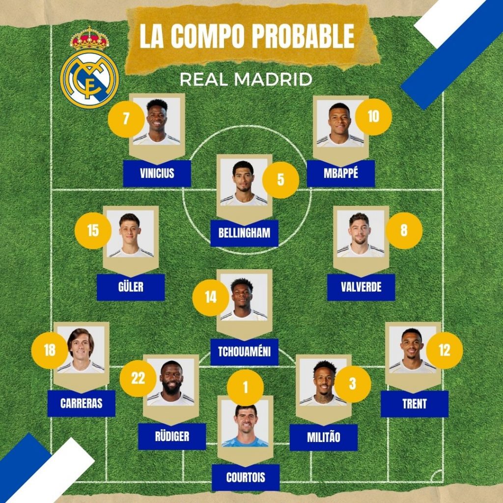 Courtois – Trent, Militão, Rüdiger, Carreras – Valverde, Tchouaméni, Güler, Bellingham – Mbappé, Vinicius.