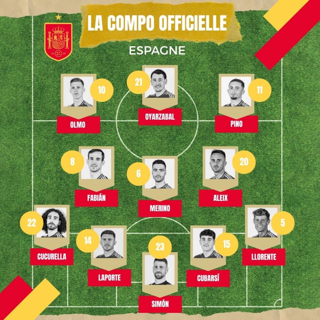Simón – Llorente, Cubarsí, Laporte, Cucurella – Aleix, Merino, Fabián – Pino, Oyarzabal, Olmo.