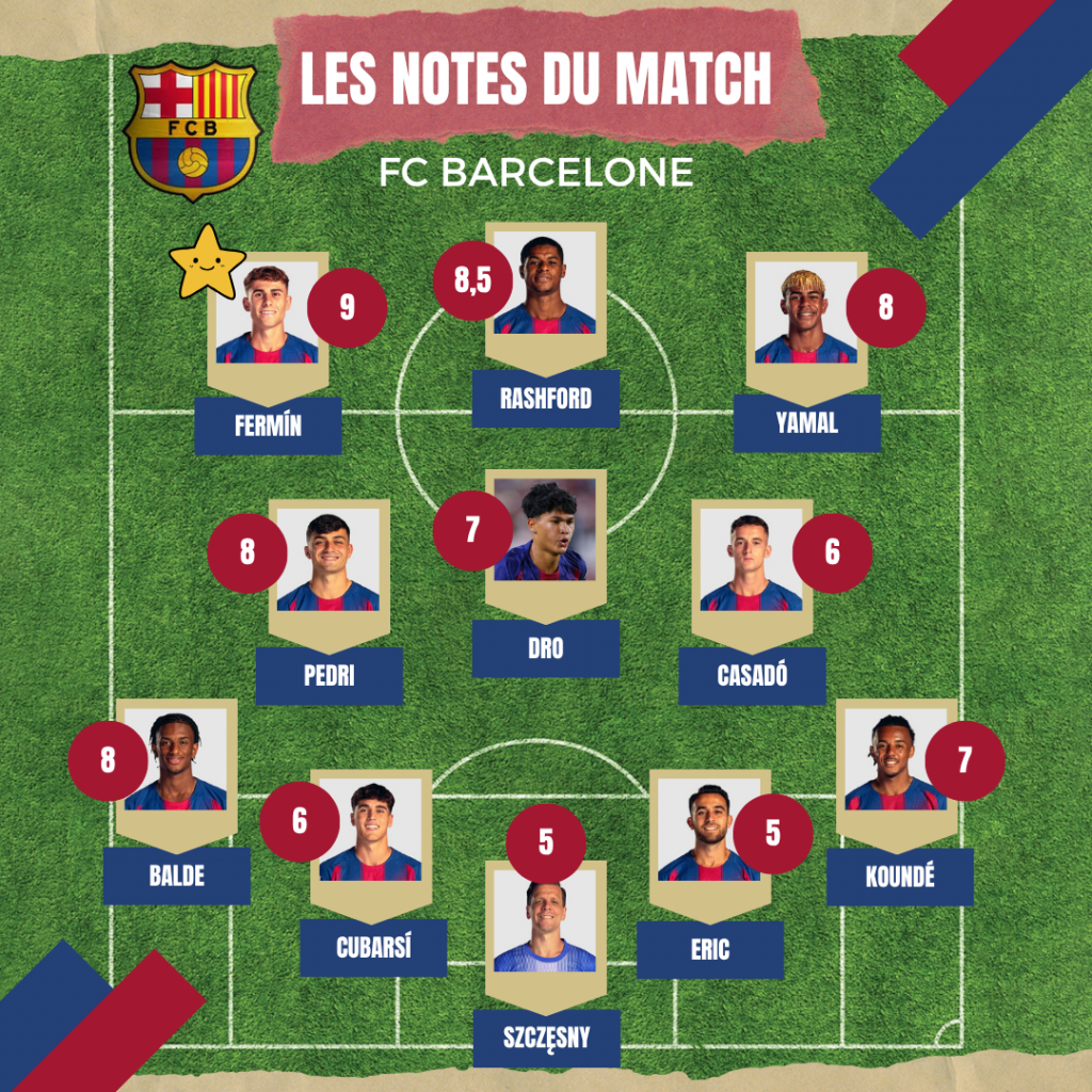 Lamine Yamal (8) : Percutant sur son aile droite comme à son habitude, Lamine a été à l’origine de l’ouverture du score de son équipe grâce à un dribble devant le gardien de but qui s’est transformé en passe décisive. Il a aussi inscrit un pénalty.
