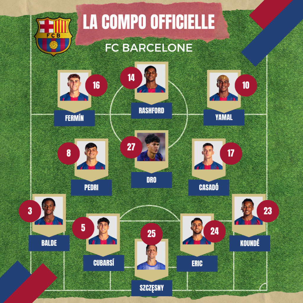 Szczęsny – Koundé, Eric, Cubarsí, Balde – Casadó, Dro, Pedri – Yamal, Rashford, Fermín.