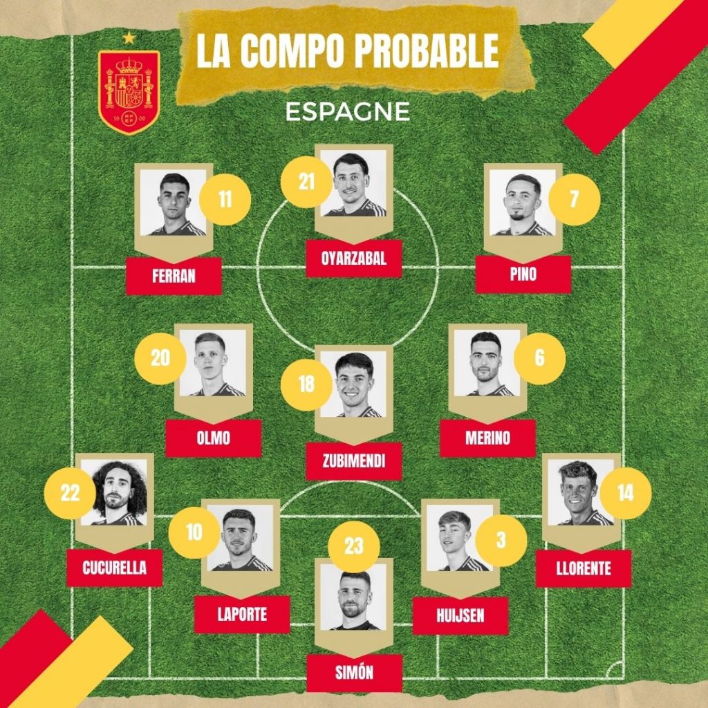 Simón – Llorente, Huijsen, Laporte, Cucurella – Olmo, Zubimendi, Merino – Pino, Oyarzabal, Ferran.
