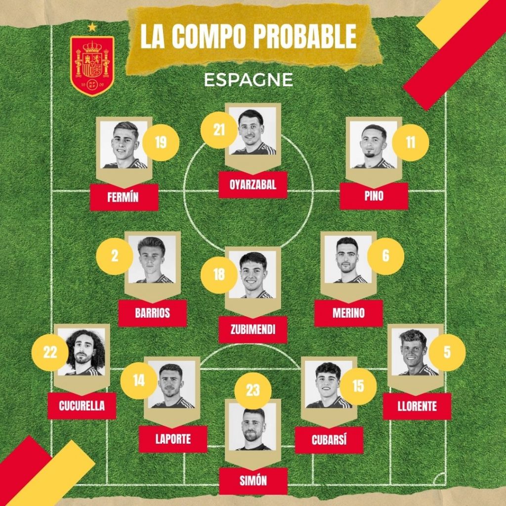 Simón – Llorente, Cubarsí, Laporte, Cucurella – Merino, Zubimendi, Barrios – Pino, Oyarzabal, Fermín.