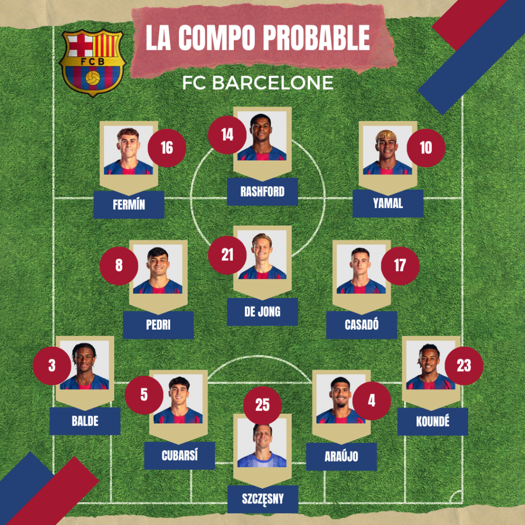 Szczęsny – Koundé, Araújo, Cubarsí, Balde – Casadó, De Jong, Pedri – Yamal, Rashford, Fermín.
